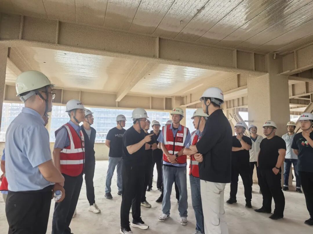 随后,在总监的带领下,全体人员观摩了项目现场。由总监、各位监理工程师向大家讲解该项目钢结构施工过程和控制要点,大家针对本项目的钢结构柱芯混凝土顶升法浇筑施工工艺展开热烈的讨论。